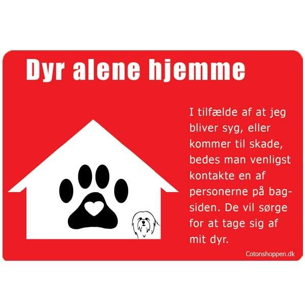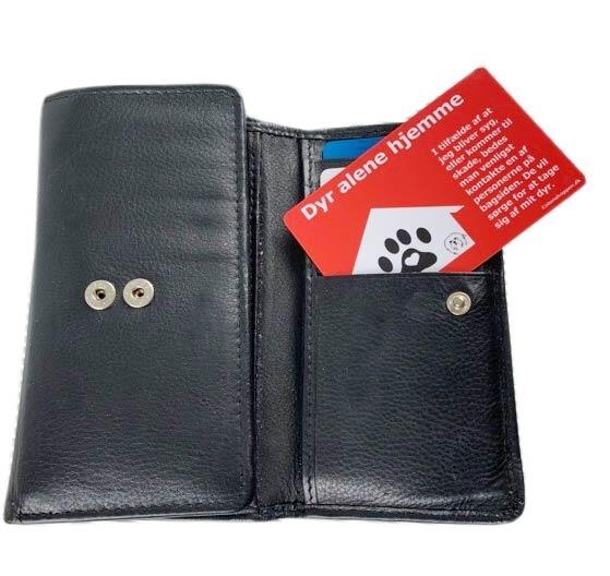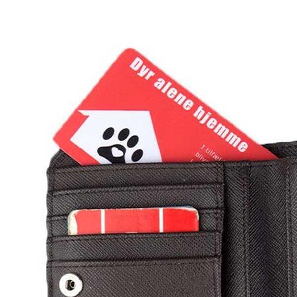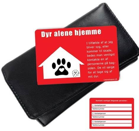 Dette smarte kort der har samme størrelse som et dankort, opbevares i din pung, og kan oplyse om at dit kæledyr opholder sig alene i dit hjem - og hvem man kan kontakte for at sørge for dem, skulle du ikke have mulighed for det selv!