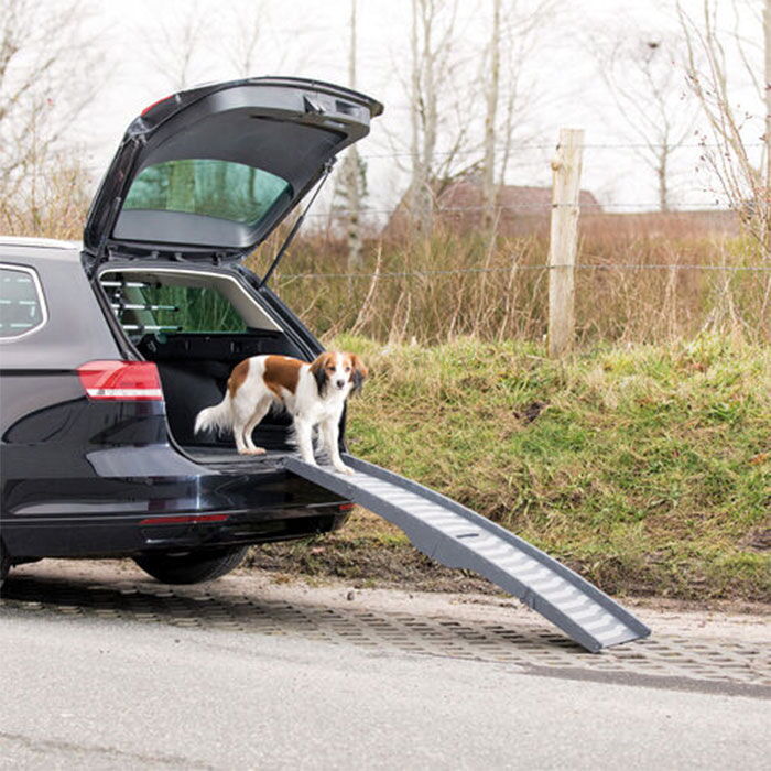 Trixie sammenklappelig rampe har en skridsikker overflade, der sikrer hunden et godt greb. Rampen er let at folde ud og folde sammen igen. Det kræver ikke meget plads at opbevare rampen, når den er klappet sammen, og den kan i de fleste tilfælde nemt opbevares ved siden af hundens bur i bagagerummet eller bag førersædet.
