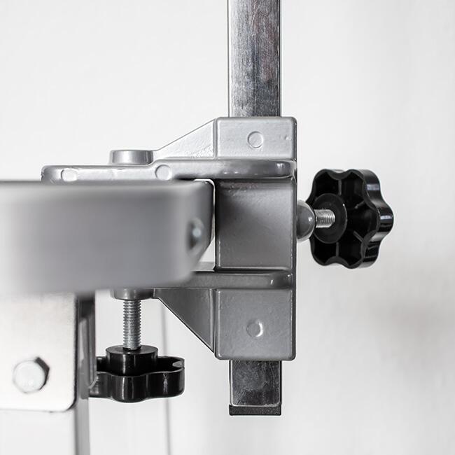 Trimmebordsgalgen er lavet af forkromede stålrør med solid bordklemme med brugervenlige fingerskruer med store knopper.