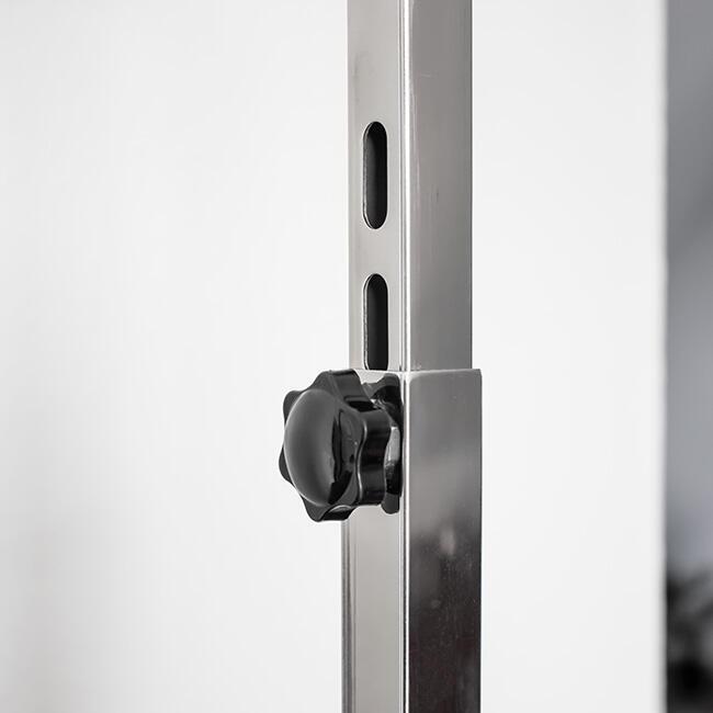 Trimmebordsgalgen er justerbar i højden fra cirka 60 centimeter til cirka 92 centimeter. I vandret retning måler den 22 centimeter fra stangen. Galgestroppens vandrette placering er justerbar i to forskellige afstande.