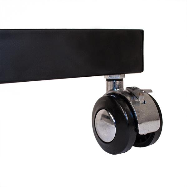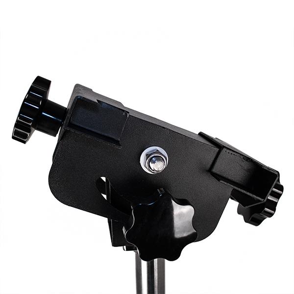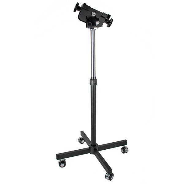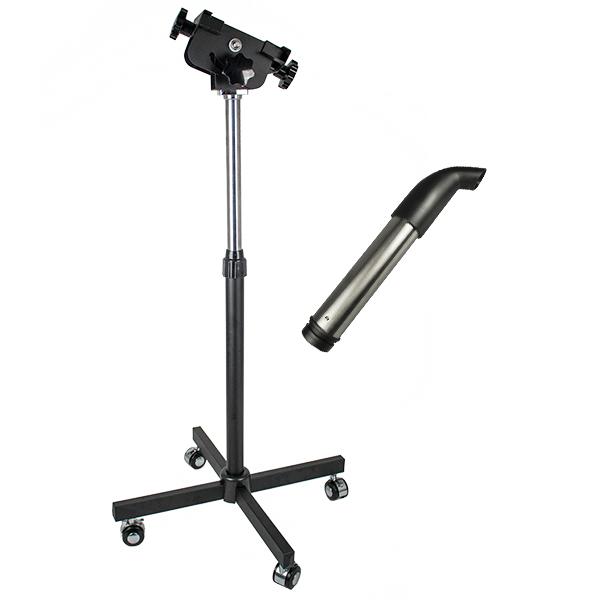 Stativet er udført i virkelig kraftig, pulverlakeret stål, og står solidt på 4 hjul. Montagen af bloweren er uhyre enkel via de kraftige, plastbelagte fingerskruer.
