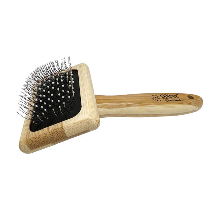 Ollipet Exclusive Bambus Karte er en vinklet metalkarte med et håndtag af bambus materiale. Karten er eminent til fjernelse af filtre i den nyvaskede pels, samt til at fjerne løst hår der måtte gemme sig i pelsen.