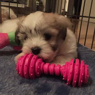 Den er yderst velegnet til hvalpe der er ved at få tænder eller er i tandskifte da hvalpelegetøjet har bløde gummiknopper der er behagelige at bide i, når de små gummer klør.