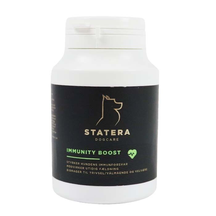 Statera Immunity Boost kan anvendes i f.eks. fældnings perioder, efter sygdom eller andre situationer hvor hunden har behov for at styrke systemet. Sammensætningen er via colostrum rig på immunglobuliner, yderligere tilsat Agrimos, en primær dyrket gærcellevæg (Saccharomyces-cerevisiae), der tilføjer et højt niveau af MOS og beta-glucaner.