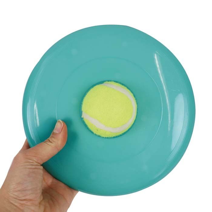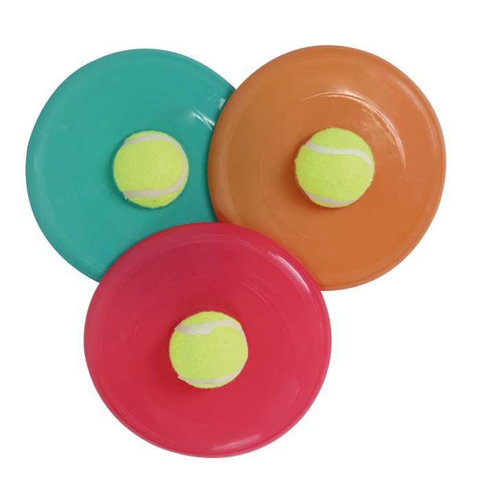 Den klassiske frisbee har fået et sjovt twist! Den har fået en tennisbold påsat i midten. Boldens funktion er at løfte frisbeen lidt over jorden, så din hund lettere kan hente den og samle den op med munden. Det er langt mere skånsomt, end når hunden fanger frisbeen i luften, hvor den let kan komme til skade med sine tænger.