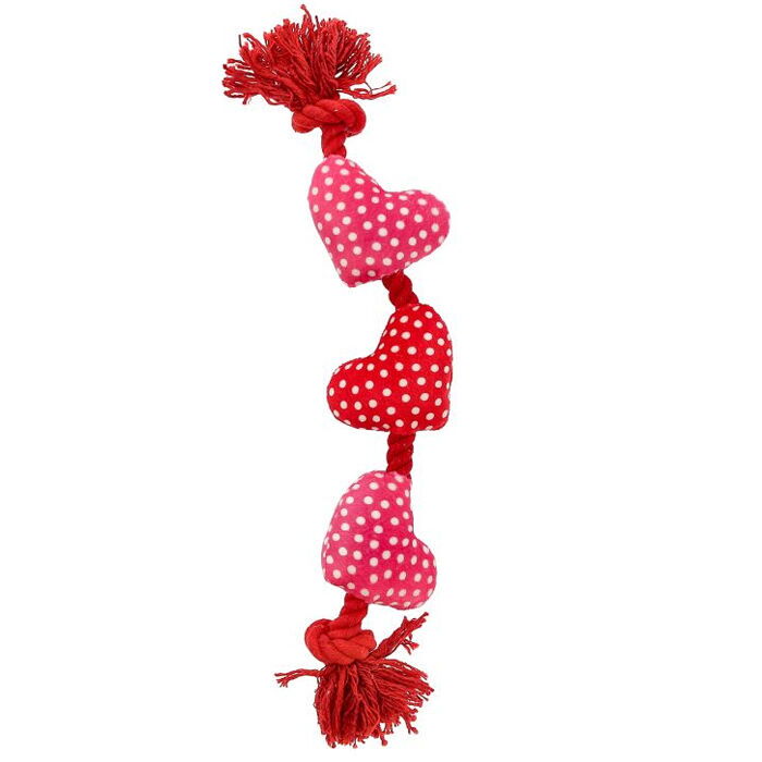 Legetøjet har form som tre plys hjerter på et knudret reb. Hvert hjerte indeholder en lille squeaker, som siger piv, når din hund bider i eller træder på legetøjet. Langt de fleste hunde vil elske den lokkende lyd, og den vil derfor fange deres opmærksomhed og interesse. På den måde vil hunden have større motivation til at lade sig aktivere gennem leg.