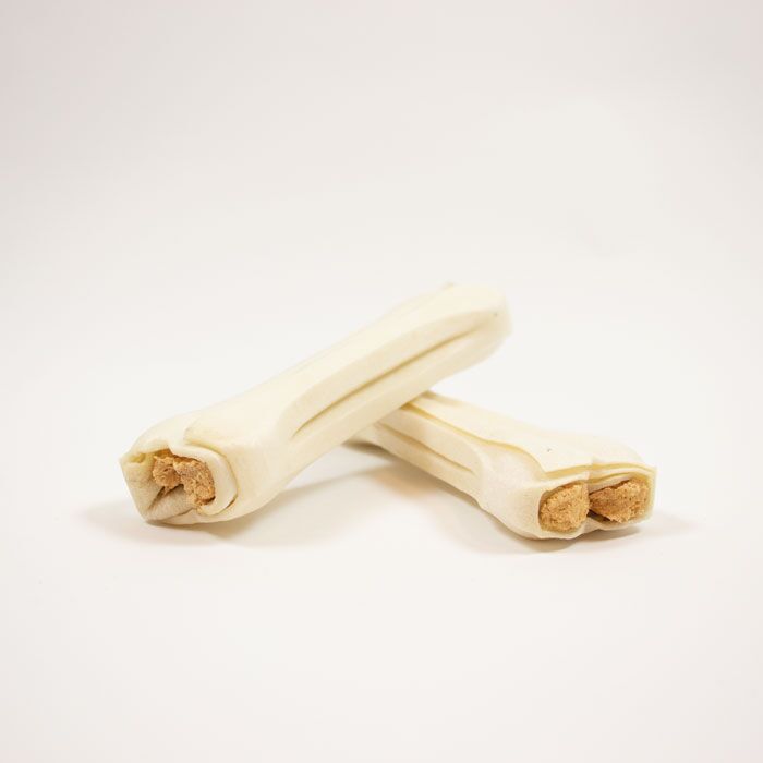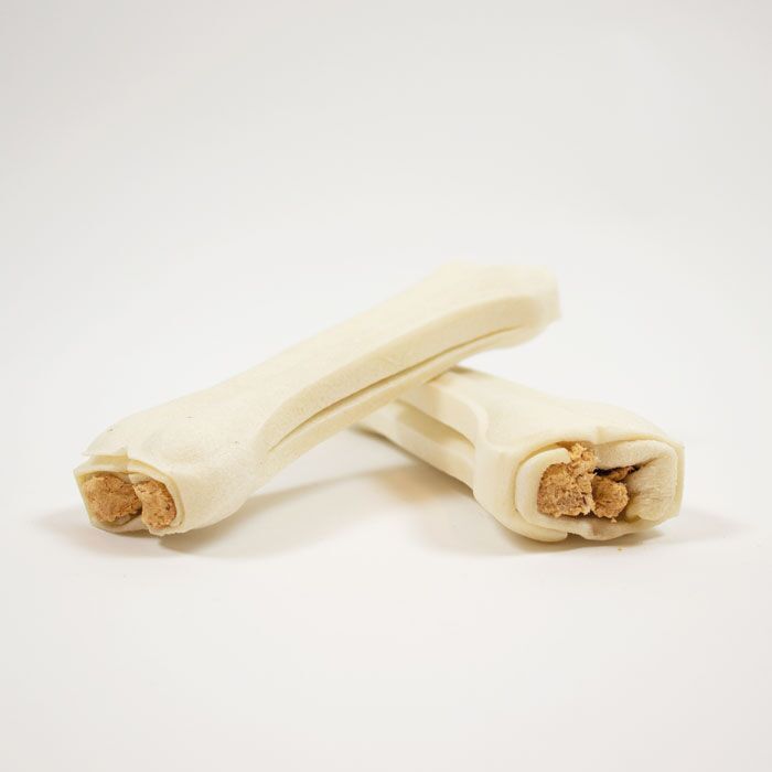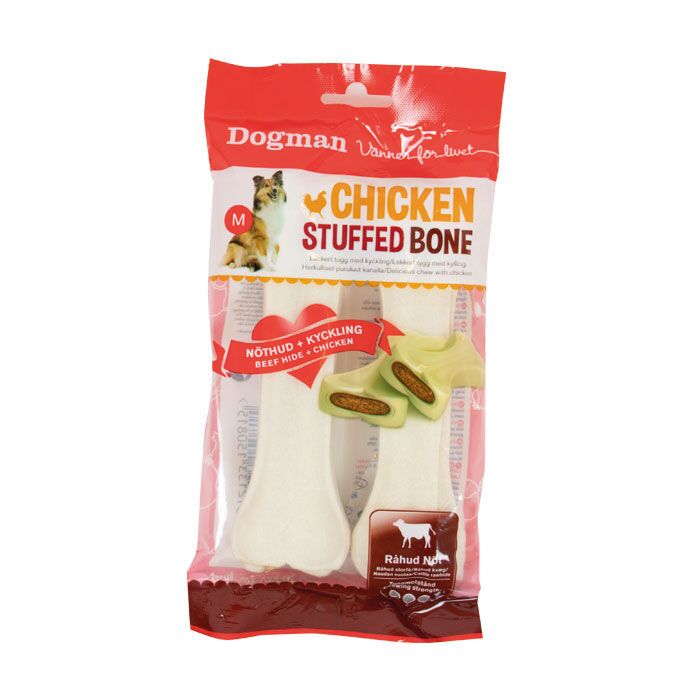 Her får din hund 2 lækre og langtidsholdbare tyggeben! Chicken Stuffed Bone er fremstillet af råhud fra kvæg og med et lækkert smagsfyldt fyld af kylling. Chicken Stuffed Bone er perfekt som snack til din hund når den rigtig skal forkæles.