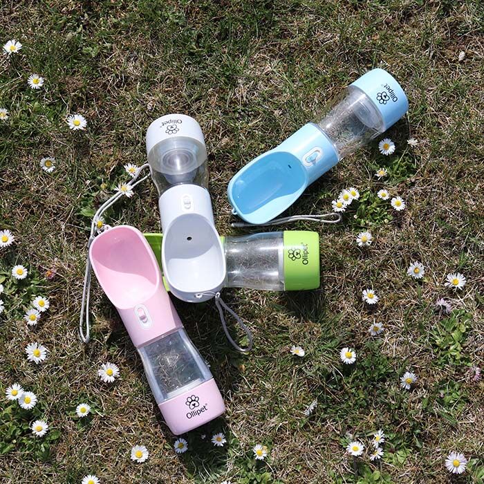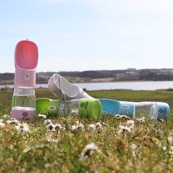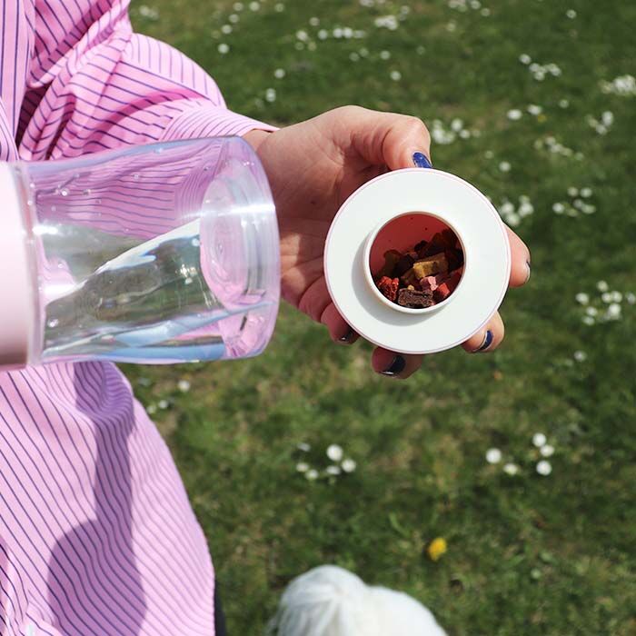 Fyld flasken op med vand og bunden op med din hunds foder, og I er klar til at tage på tur.