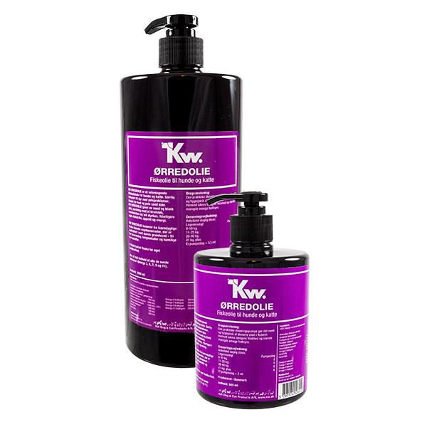 KW Ørredolie er et velsmagende fodertilskud til hunde og katte. Olien er udvundet fra danske regnbueørreder, som er opdrættet i rent, dansk grundvand.