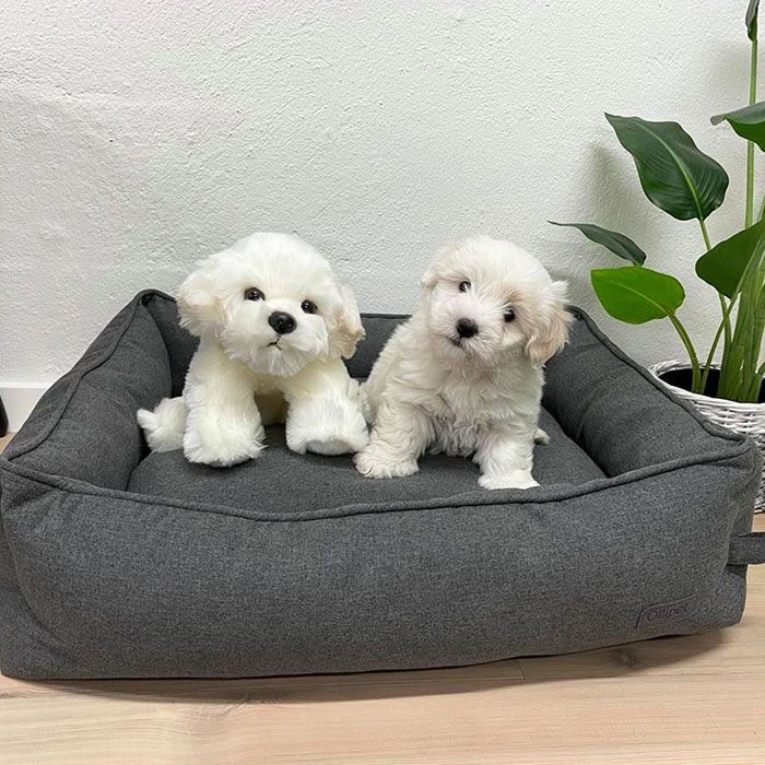 Ollie er en skøn naturtro plyshund, der let kan gå for at være en Coton de Tulear hvalp eller en klippet, voksen hund. Med sit runde hoved kunne han også gå for at være en Bichon Frisé.