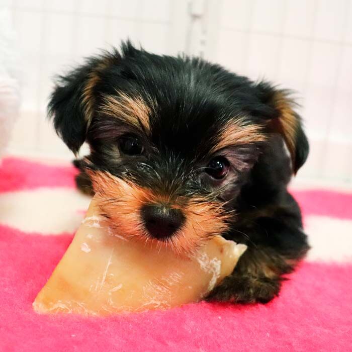 Vi har testet kalvekloven på vores egne hvalpe med stor succes! Her er det lille Tulle på 6 uger, der er ved at få tænder. Hun elsker sin klov og kan bruge lang tid på den. Her ligger hun i haven og gnaver, men hun har også en i stuen.