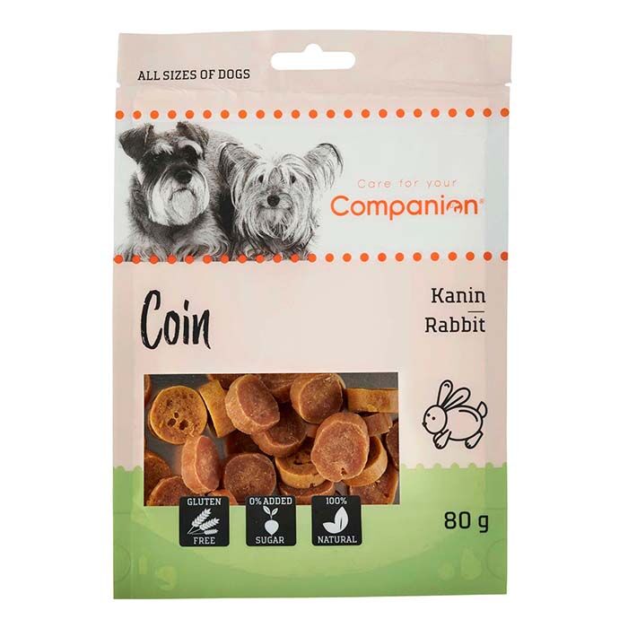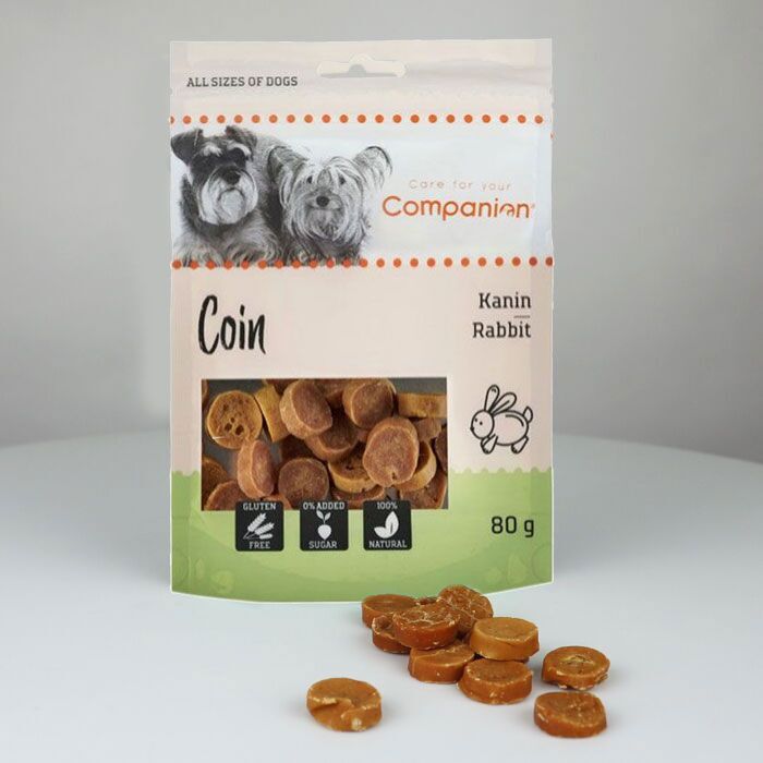 Disse lækre kødfyldte mønter med kanin vil få de fleste hunde til at hoppe. Companion Rabbit Coins kommer i mundrette størrelser, formet som små mønter. Indeholder ingen sukker og ingen tilsætningsstoffer og konserveringsmiddel, desuden er de glutenfrie. En lækker sund godbid til hunde i alle aldre.