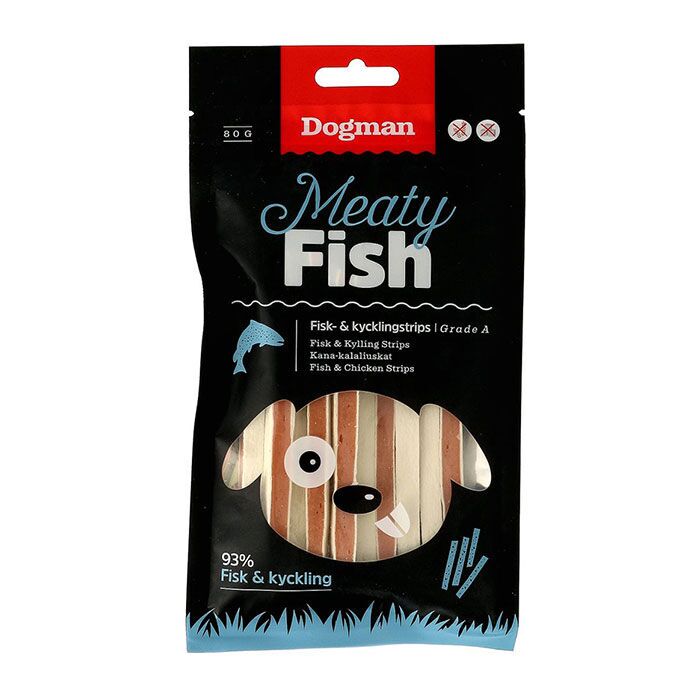 Med Dogmans Meaty Fish får du nogle yderst delikate hundegodbidder med en uimodståelig smag af kylling og fisk. Godbidderne kommer i små stænger, som er let at brække i mindre stykker. Dette gør dem særdeles velegnet til at bruge som belønningsgodbid. Godbidsstængerne kommer i en praktisk emballage med genluk.