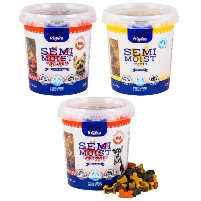 Frigera Semi-Moist Treats leveres i en praktisk plastspand med tætlukkende låg, som sørger for, at godbidderne holder sig lækre og saftige selv efter åbning. Spanden indeholder 500 g godbidder og i denne pakke får du hele 3 spande, i alt 1,5kg godbidder