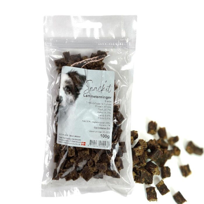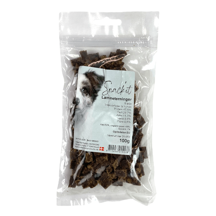 Lammeterningerne fra Snack'it er en 100% naturlig godbid, som hverken indeholder korn, gluten, soja, farvestoffer eller andre tilsætningsstoffer. Godbidderne er producerede i EU og indeholder kød fra europæiske lam.