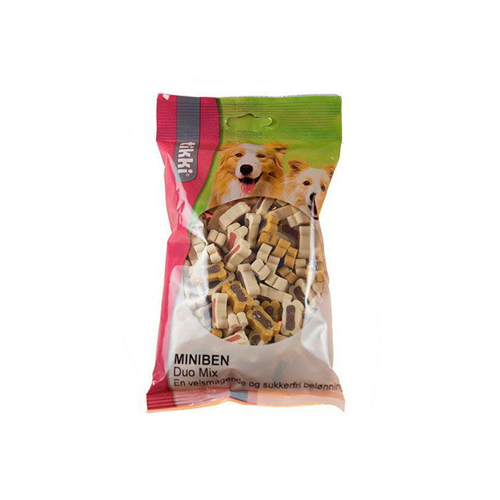 - Miniben Duomix: Sammensætning korn (minimum 4% ris), kød- og animalske biprodukter (minimum 4% lam, 4% vildt), vegetabilske biprodukter, olie og fedt, fisk og biprodukter fra fisk (minimum 4% laks), vegetabilsk protein ekstrakt, mineraler. Analyse råprotein 12%, råaske 3,0%, råfedt 6,0%, råfibre 3,0%, vand 18,0%