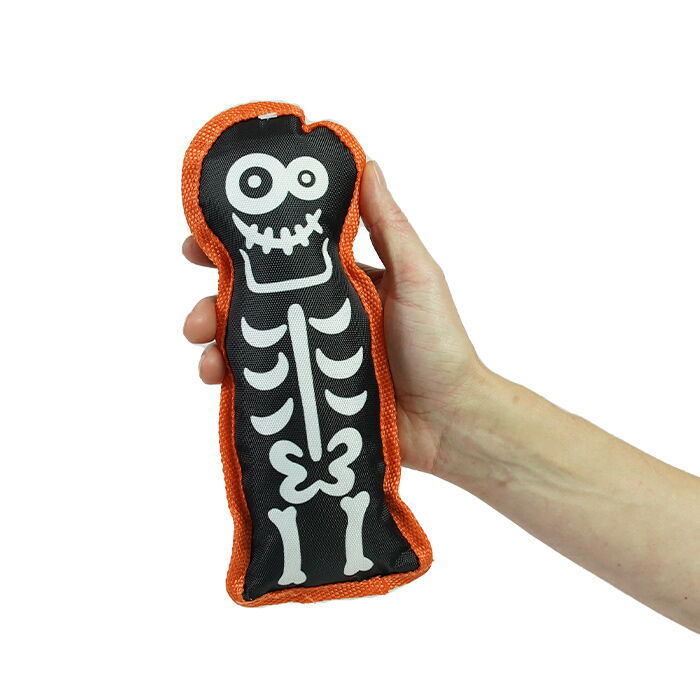 Dette halloween skelet er fremstillet i kraftige og slidstærke materialer. Bamsen er forsynet med en forstærket kant, som er med til at sikre, at bamsen ikke giver op efter én enkelt halloweenfest. Skelettet har desuden ikke påsyede arme, ben eller lignende, som din hund vil kunne bide af. På den måde undgår du huller i bamsen og rod fra bamsefyld.