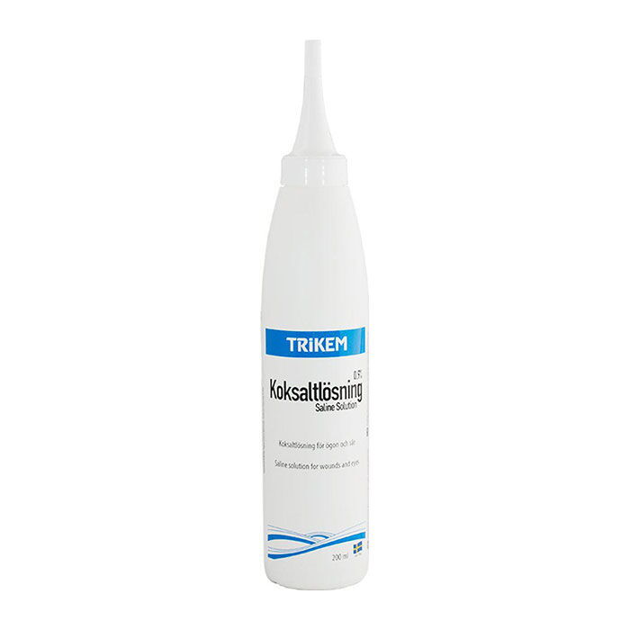 Trikem Koksaltlösning er en fysiologisk saltvandsopløsning til rengøring af sår og hudlæsioner samt skylning af øjne hos dyr.