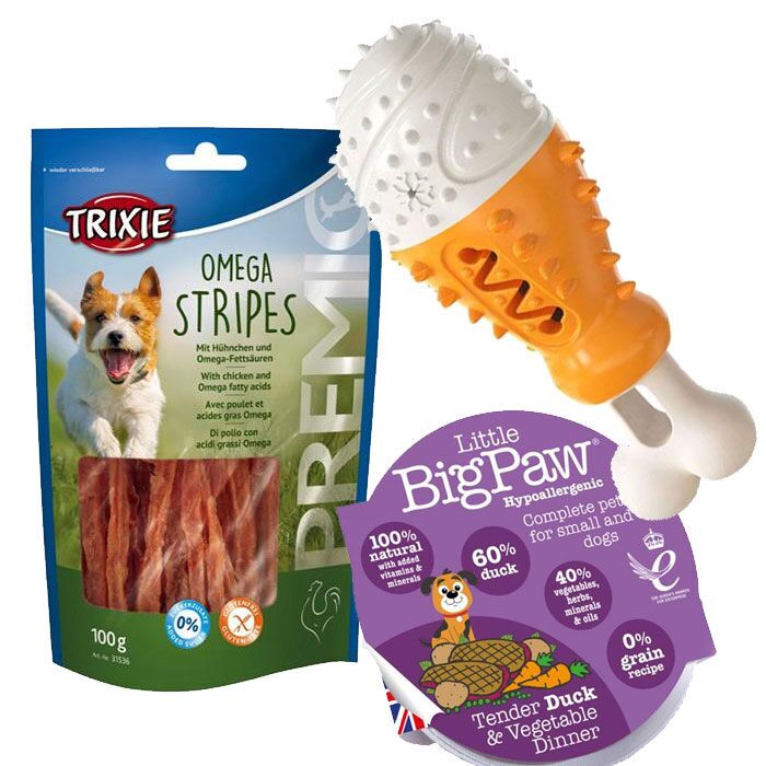Fyld det lækre kødben med lækkert vådfoder og omega stripes fra Trixie