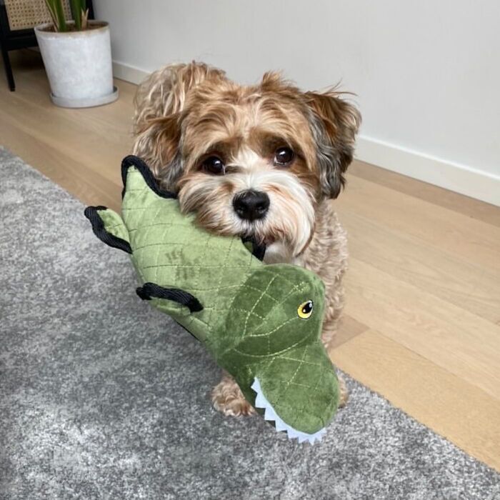 Krokodillen har et moderne sødt design, som passer godt ind i det moderne hjem. Bamsen kan holde til mange timers leg, og vil helt sikkert glæde din hund. Inderst i bamsen er der en squeaker, som piver når hunden bider i den.