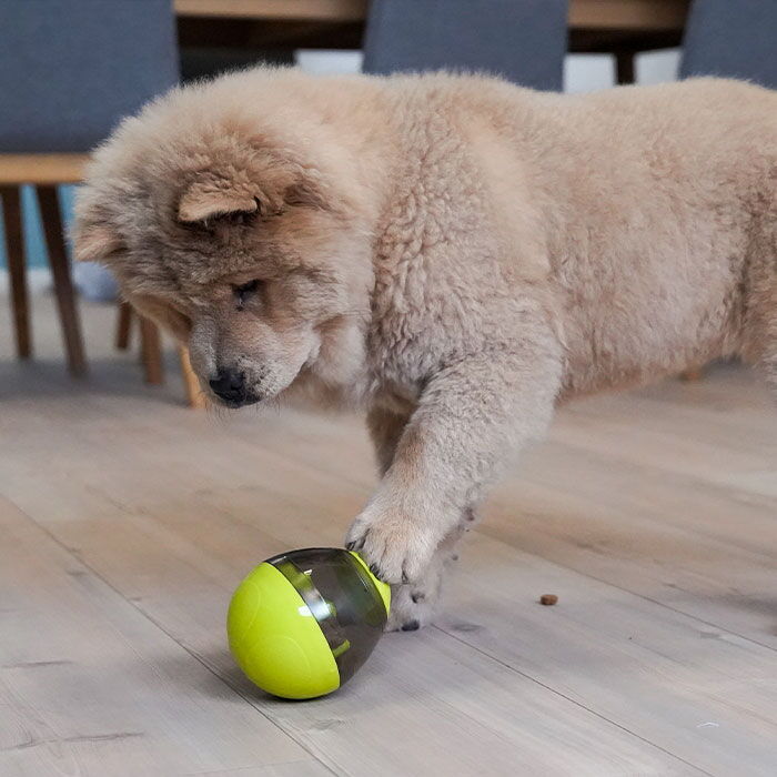Aktiveringsægget er tungest i bunden, hvilket giver det en vippe-funktion, som gør, at ægget altid svinger op igen, når din hund puffer til det.