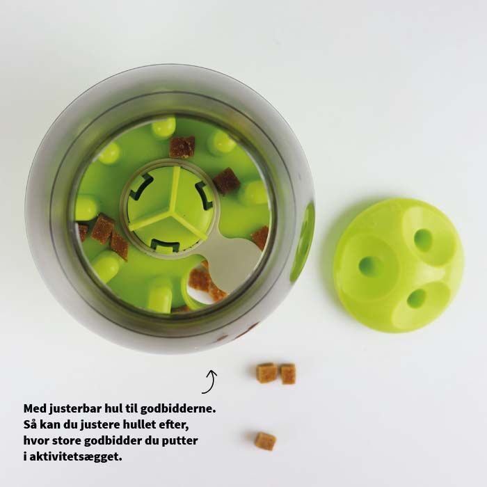 - Toppen kan tages af, og godbidderne kan let puttes i. Toppen har små huller, som gør, at hunden kan dufte de lækre godbidder