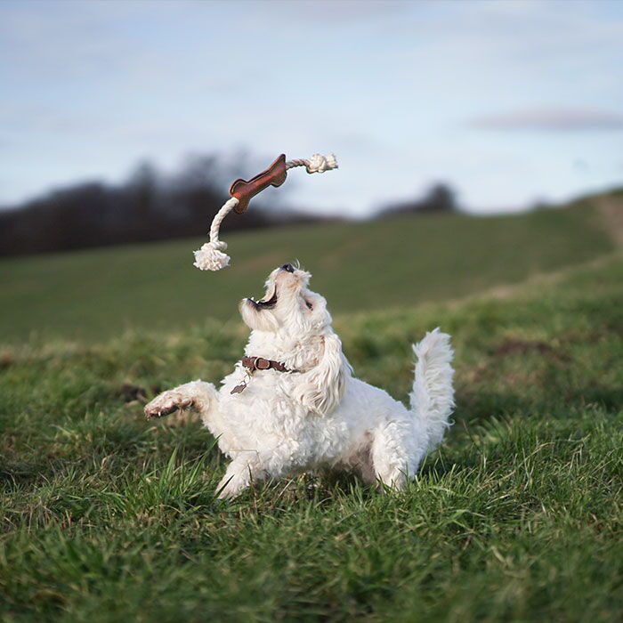 Læderet er syet sammen med dobbelte syninger, hvilket gør legetøjet ekstra holdbart. Mellem de to tykke stykker læder er et robust bomuldsreb fastgjort. Rebet har en skøn struktur, som både virker tandrensende og stimulerende på hundens tandkød.