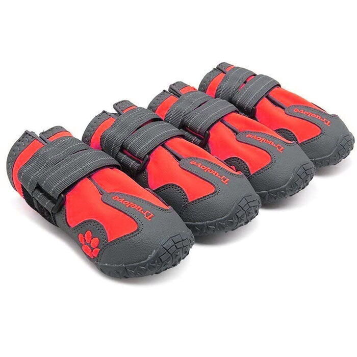 Truelove Hundesko er lavet med en forstærket gummisål, der skåner hundens trædepuder. Skoene er fremstillet i et slidstærkt og vandafvisende materiale, som sidder godt på hundens poter.