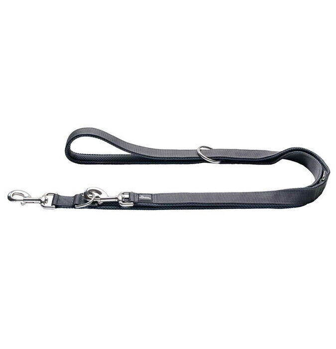 Linen har påsat 2 rustfri ringe og 2 karabinhager, der kan bruges når du vil ændre længden på linen, eller spænde din hund fast omk. en bænk eller lignende.
