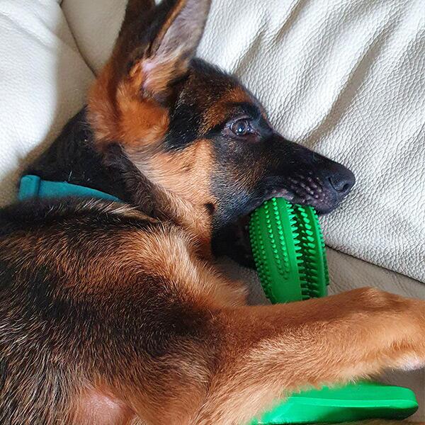 - Vi anbefaler at din hund får lov at gnave ca. 3-5 min i tandbørsten hver dag.