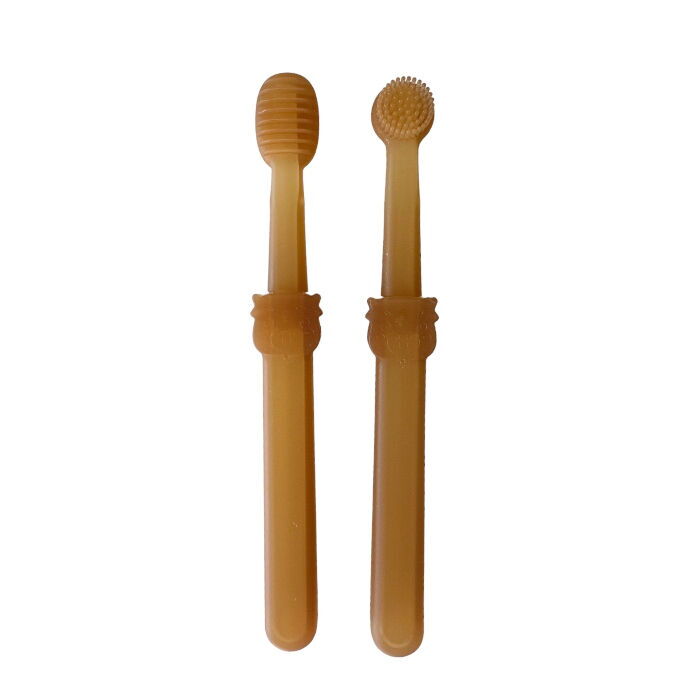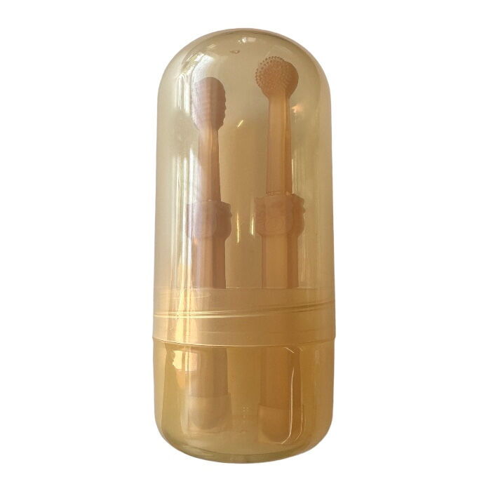 - 2 stk. bløde silikonetandbørster med tilhørende etui
