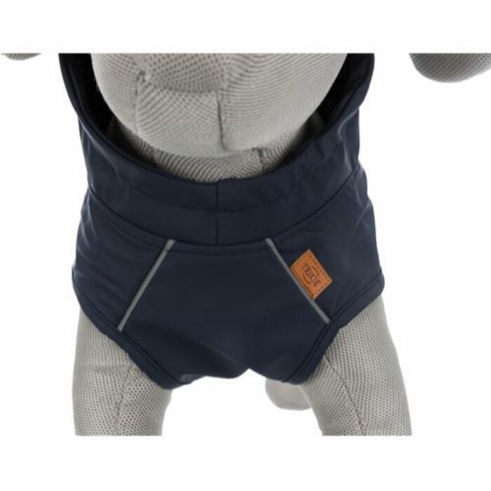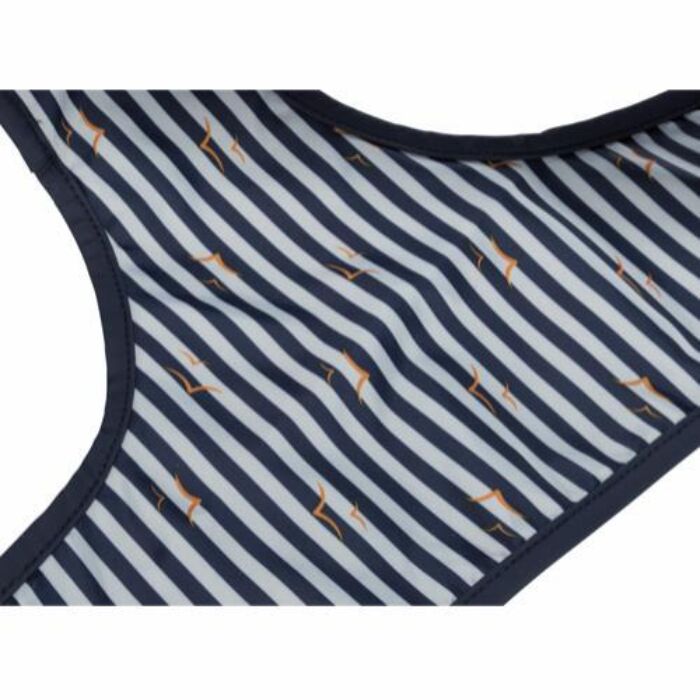 Regnfrakken er produceret i vandtæt polyester, der holder enhver form for vand ude. Frakkens design, er udover at være vandtæt, produceret i et superfint nordisk design, med en vandtæt, mørkeblå yderside, og en inderside i fint maritimt blå- og hvidstribet mønster med fugle på. Ydersiden er desuden forsynet med reflekskanter, der sikrer at din hund bliver set i mørket.