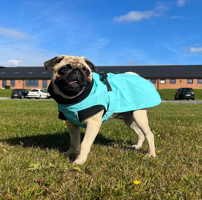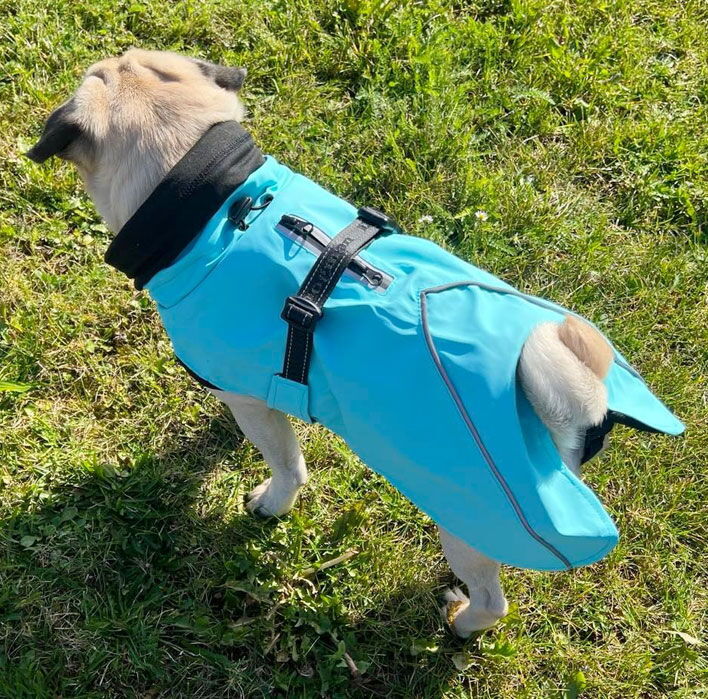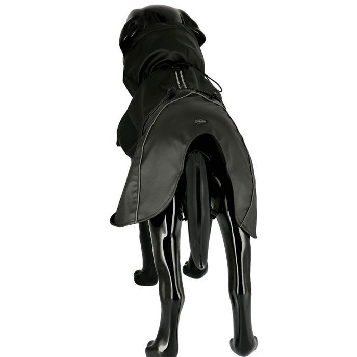 Regnfrakken holder hunden tør samtidig med, at den beskytter mod vind. Indvendigt er regnfrakken foret med mesh, som sikrer, at hunden ikke fryser samtidig med, at det lader hunden ånde.