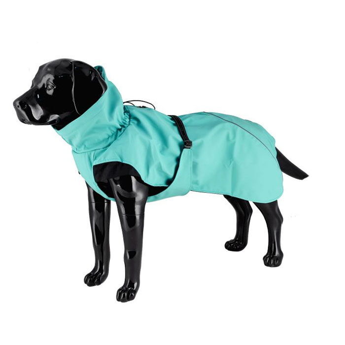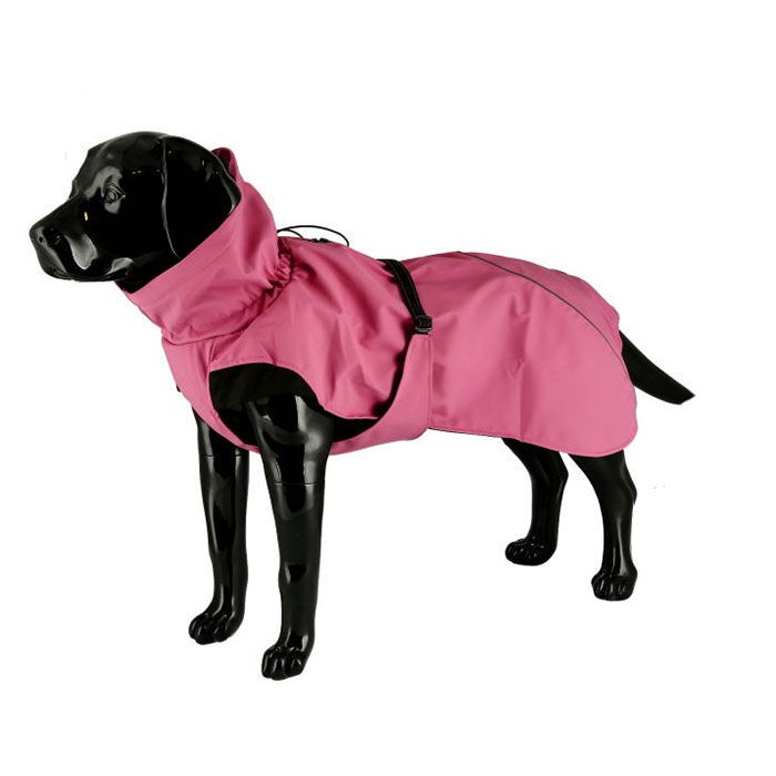 Dækkenet har en høj krave, som kan justeres med snoretræk, så vidden passer til lige præcis din hund. Regnfrakken er desuden udstyret med reflekser, som sørger for, at hunden er synlig i trafikken.