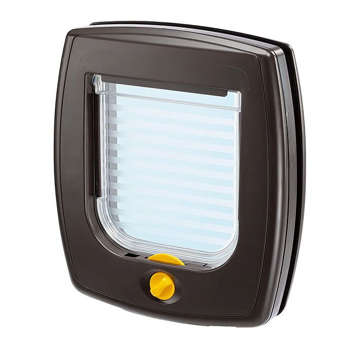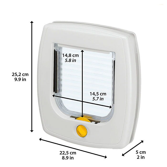 Hundelemmen er udstyret med et 4-vejslåsesystem, som giver dig mulighed for at åbne/lukke lemmen, som du ønsker: Kun indgang, kun udgang, både ind- og udgang eller lukket.