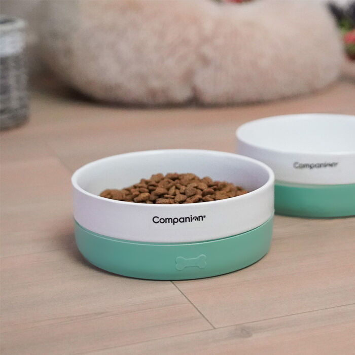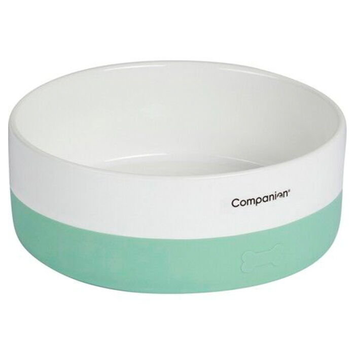 Skålen er fremstillet i keramik, og i bunden har den silikonebelægning i en flot, grøn farve. Silikonebelægningen sikrer, at skålen står stabilt og ikke skrider, mens hunden spiser. Logoet "Companion" kan fjernes, hvis man ikke ønsker at have dette på