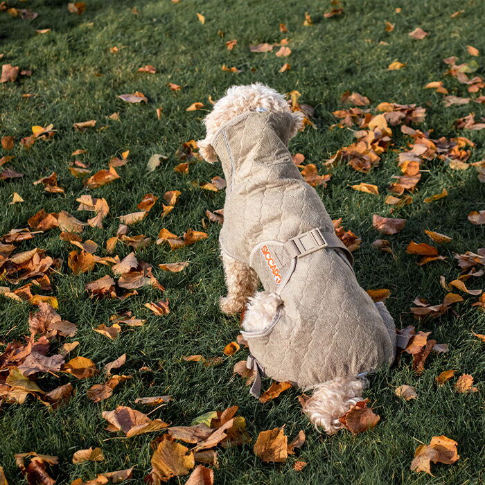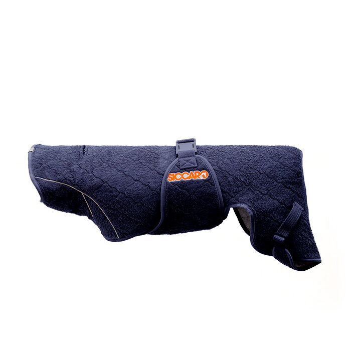SICCARO Solution tørredækken kan absorbere 7 gange dens egen vægt, og er designet med diskrete refleksdetaljer ved syningerne for bedre synlighed, når hunden har den på. Den er med hul i nakken, så du får nem tilgang til halsbånd eller sele. Dette gør det dejlig nemt at putte tørredragten på hunden, så I hurtigt kan fortsætte jeres gåtur.