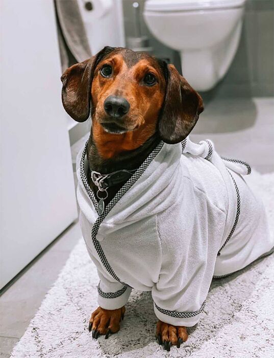 Vi anbefaler at man tørrer hunden med et normalt håndklæde efter bad, hvorefter man kan påføre badekåben. Herefter kan hunden hygge sig i badekåben, imens den bliver tør. Mange hunde elsker at blive pakket ind efter et bad, de bliver søvnlige og holdes varme.