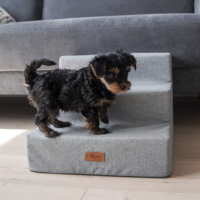 Med Ollipet Up Stairs får du adgang til en intelligent hundetrappe, der kan placeres præcis, hvor du ønsker det. Den er konstrueret af let skummateriale og er dækket af blødt stof, hvilket giver en behagelig overflade. Betrækket er aftageligt med en lynlås rundt langs bundkanten og kan let vaskes på 30 grader ved skåneprogram. Efter vask skal det lufttørre. Hundetrappen er desuden udstyret med små silikonepoter under bunden, der sikrer ekstra stabilitet og forhindrer, at den glider.