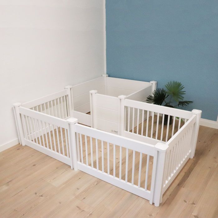 Dette sæt er perfekt til dig, som venter et kuld hvalpe. Hvalpene fødes i fødekassen. Når hvalpene bliver større og stærkere, kan man bygge kravlegården, således, at hvalpene får mere plads at bevæge sig på.