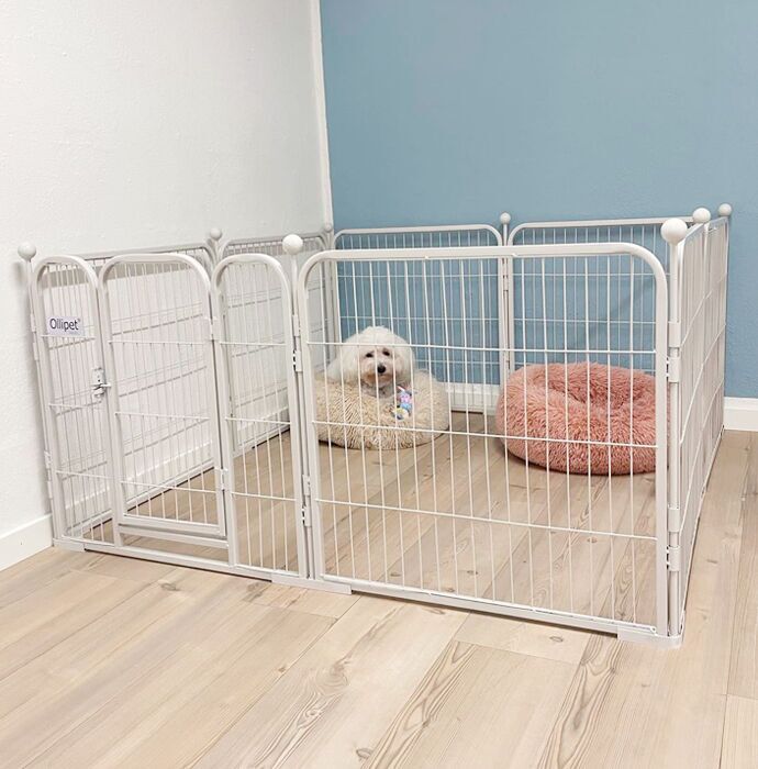 Flot og stilren hvalpegård i hvid-lakeret rustbeskyttet stål → Med gulvbeskytter