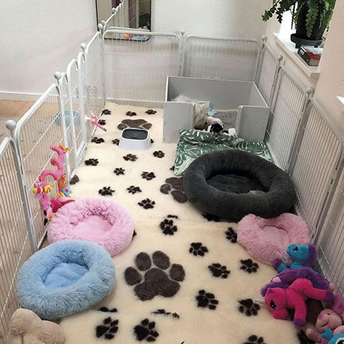 Indret hvalpegården med bløde vetbedtæpper og tisseunderlag. Et hvalpehus og hvalpelegetøj skal der selvfølgelig også til. Hvalpene skal ofte udfordres med nyt legetøj, så deres sanser bliver udviklet. Hvalpegården kan også bruges til kaniner.