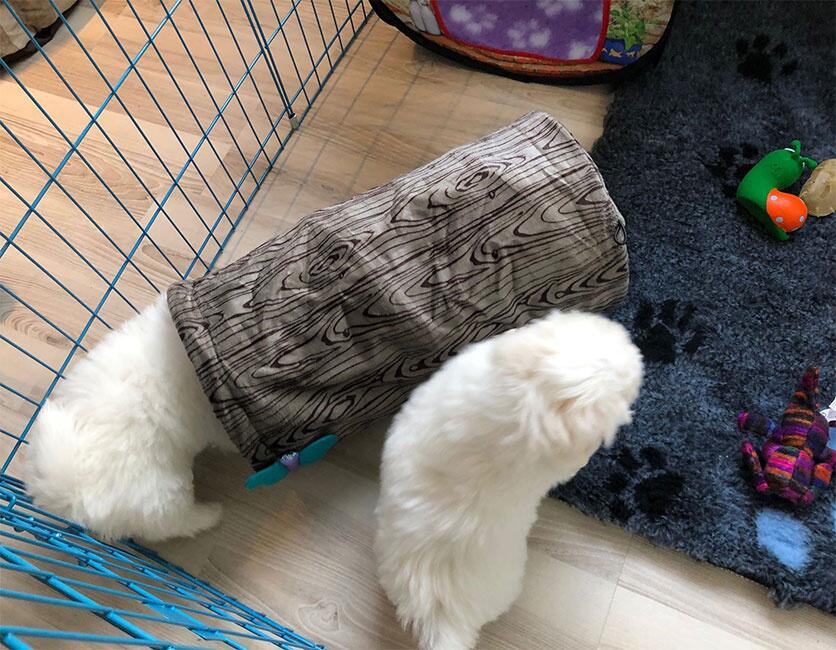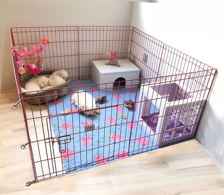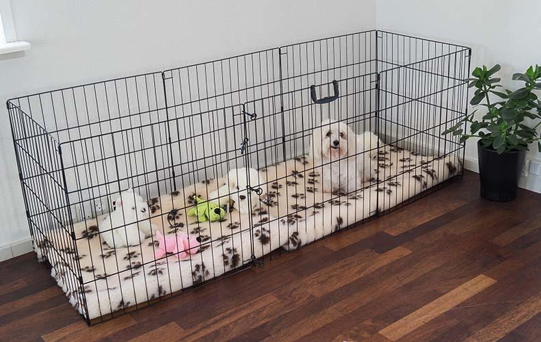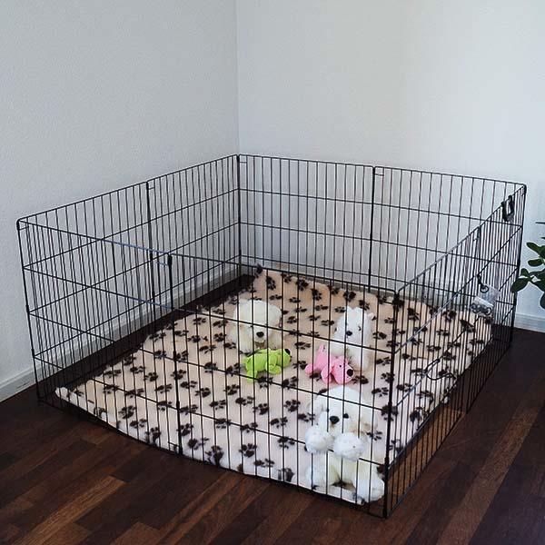- Vær opmærksom på, at hvalpegården indenfor bør stå på beskyttende underlag, som gulvtæppe eller lignende. Vi kan anbefale et vetbedtæppe som underlag, da det også er blødt og lækkert for hunden/hvalpen.