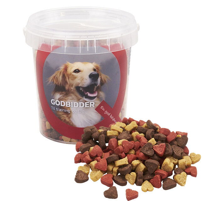 Indbydende bløde godbidder formet som små kødben eller hjerter. En fin plastikspand med 500g. der sikre at godbidderne forbliver friske efter åbning. Godbidderne er en blanding med 4 smagsvarianter - fjerkræ, lam, kallun og fisk.
