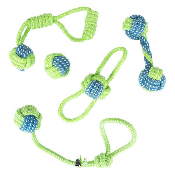 Går du ind for at din hvalps hvalpelegetøj skal være stilrent og ikke for multifarvet, vil du elske denne pakke. Rebene er forskellige, men farvekombinationerne er de samme blå og grønne med hvideprikker, så de virker sammenhængende.