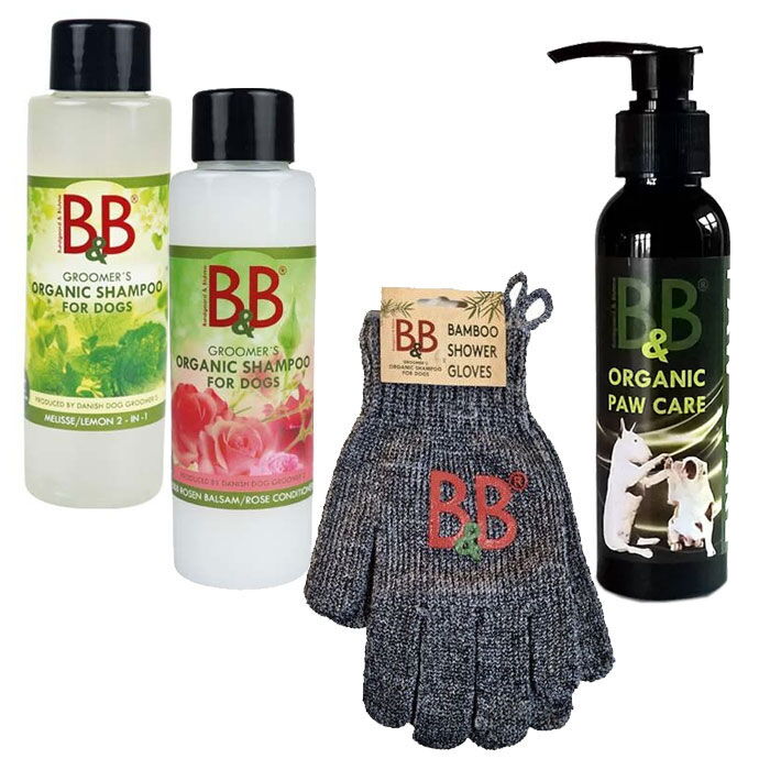 B&Bs hundeshampoo-produkter er alle økologiske og fri for E-numre, silikone, kunstige karvestoffer og parabener. I dette sæt får du en Melisse Balm 2in1, en Rose Conditioner, Paw Care Potepleje samt 1 par vaskehandsker - alt sammen fra B&B Økologisk Hundeshampoo.