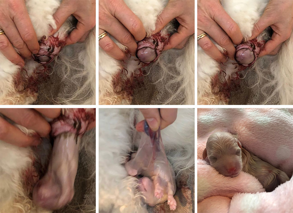 Tæven nærmer sig fødslen af den første hvalp. Du kan pludselig se hvalpen, når tæven presser. Efter nogle gode presseveer fødes hvalpen. Nogle tæver føder i total stilhed, mens andre tæver giver høje hvin fra sig af smerte. Herunder ses en lille hvalp der fødes. Kom gerne lidt glidecreme på, så kommer hvalpen lettere ud. Nogle hvalpe fødes med bagenden først (sædefødsel), dette betyder ikke noget, så det skal du ikke være bekymret for.