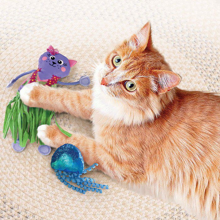 Vandmanden er fremstillet af et skinnende materiale, som skaber blikfang, og gør det uimodståeligt at give den et legesygt potedask. Vandmanden har desuden blafrende tentakler, som vil bevæge sig livligt, når katten leger med den. Din kat vil elske plysdyrenes sjove teksturer og flyvske påhæng.