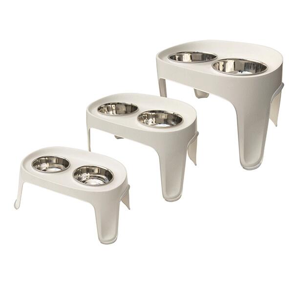 Flot stativ i hvidt kraftig plast med 2 aftagelige rustfri skåle.