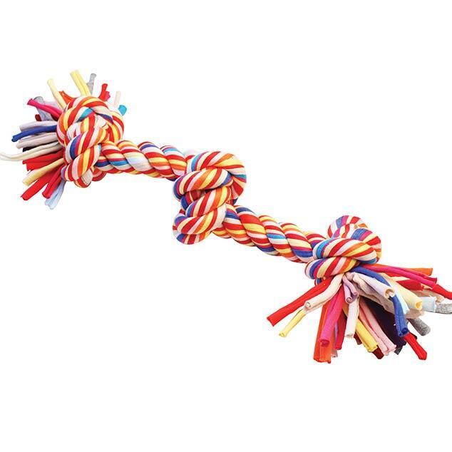 Dette knudereb er fremstillet af bløde stofrester fra tekstilindustrien der normalt bare bliver kasseret. Jersey resterne bliver snoet hårdt sammen til kraftig og slidstærkt reb der anvendt til hundelegetøj.
